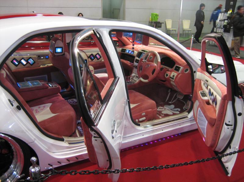 クラウンのカスタムカーです、内装をスウェードのピンクでコーディネートがグッドですw